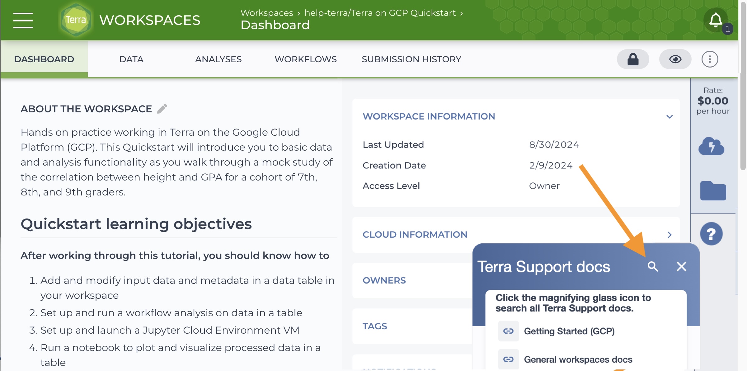 reveals relevant articles. Note that clicking on the magnifying glass (indicated by an arrow below) exposes a field for searching Terra Support docs right from the workspace.